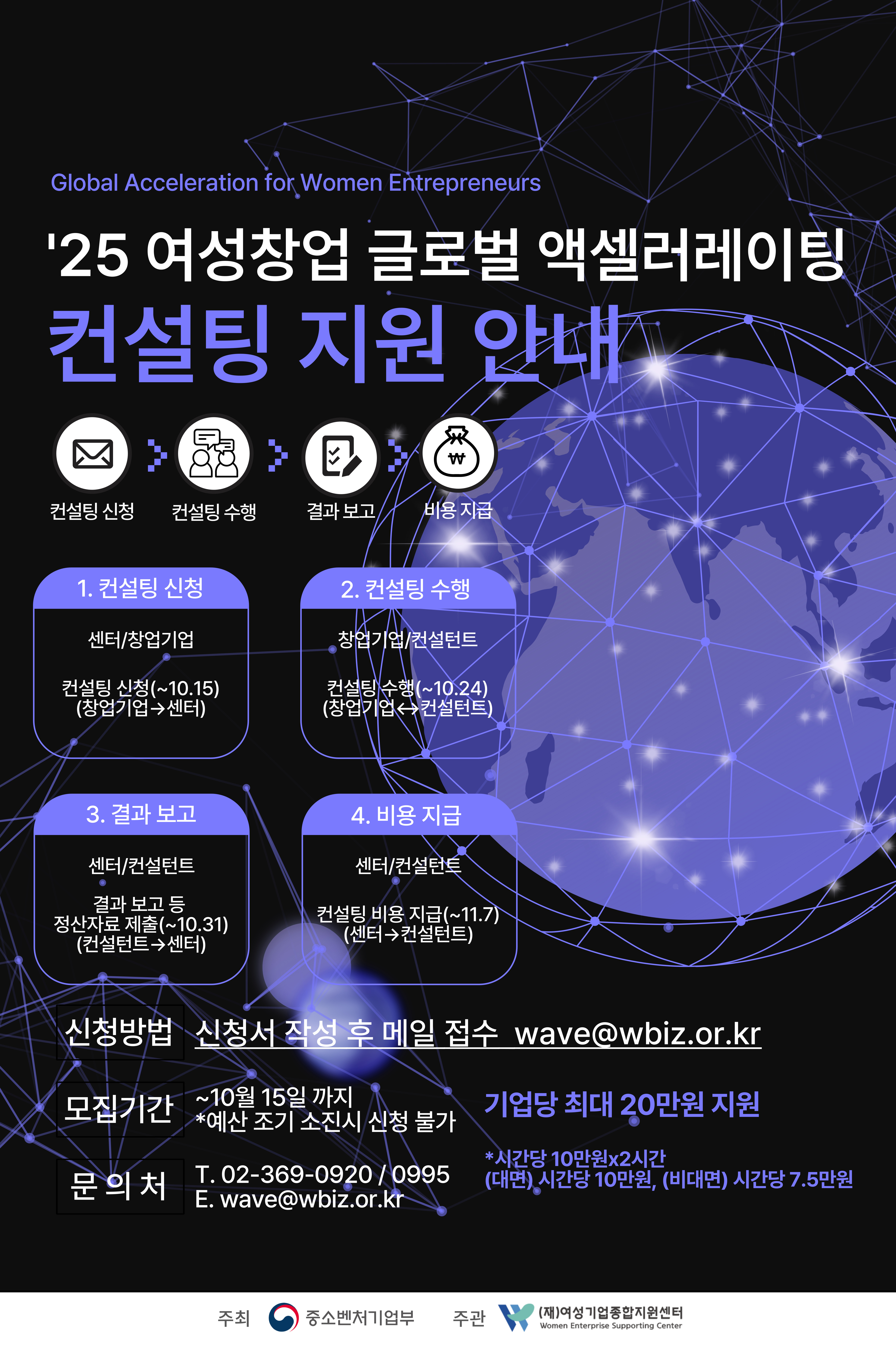 1) 지원대상: 2025년 여성창업 글로벌 액셀러레이팅 컨설팅을 희망하는 창업 7년 미만 여성창업기업