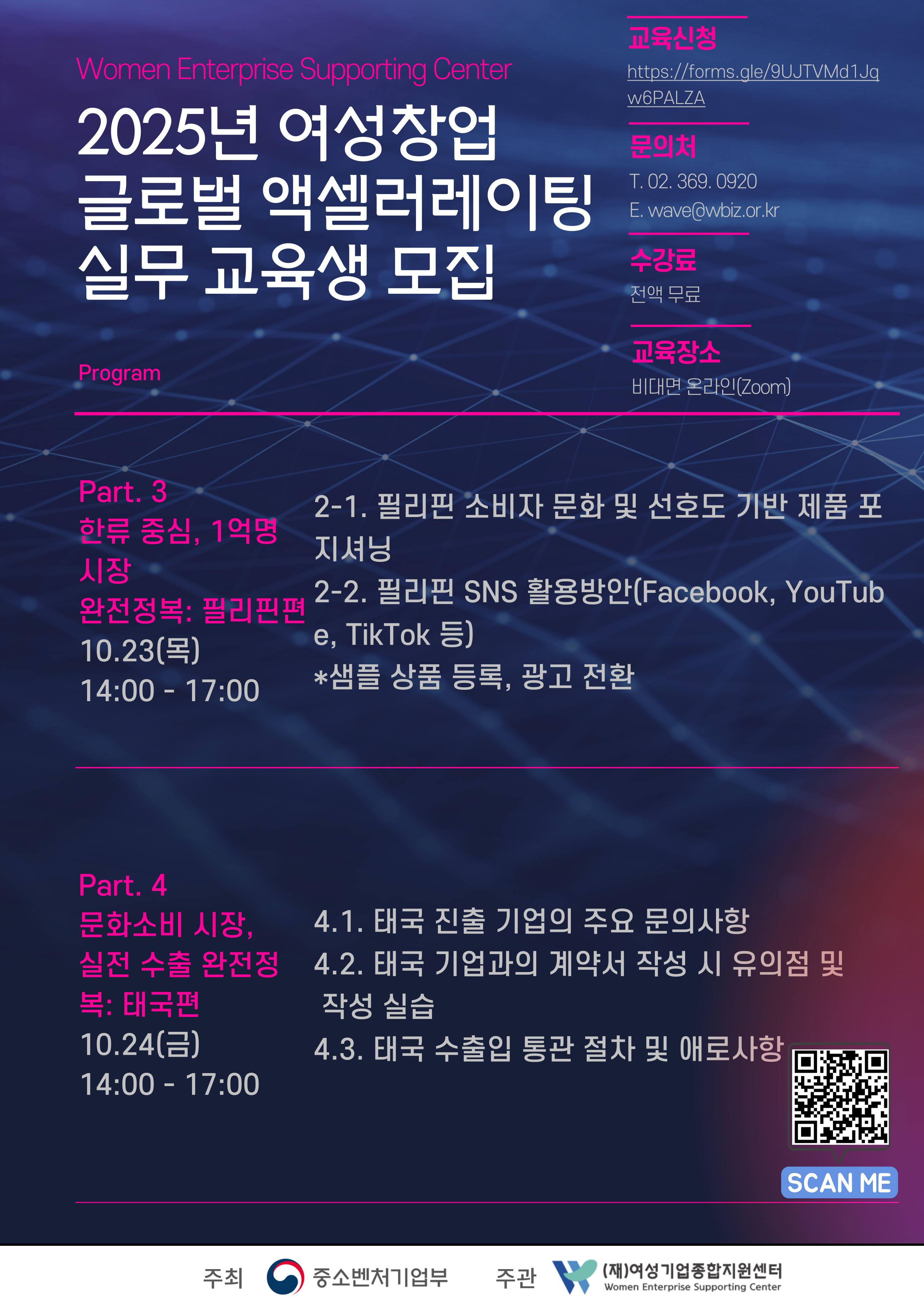 2025년 여성창업 글로벌 액셀러레이팅 제2차 실무 교육생 모집(~10.22)