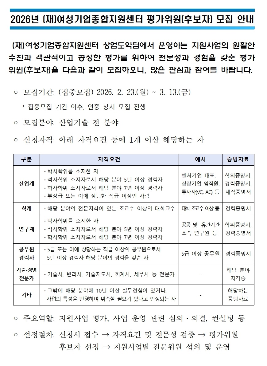 2026년 (재)여성기업종합지원센터 평가위원(후보자) 모집 안내