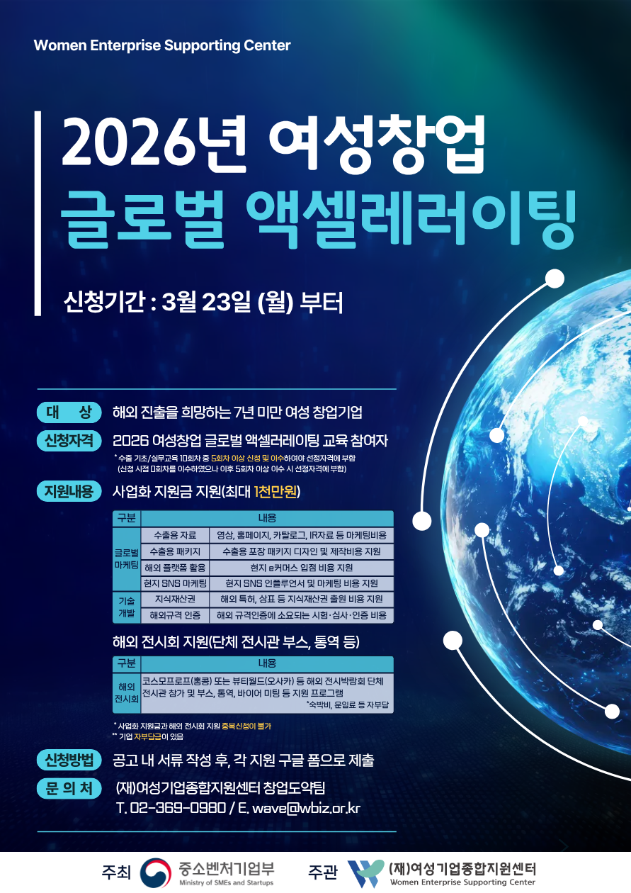 「2026년 여성창업 글로벌 액셀러레이팅」 참여기업을 모집하오니 많은 신청 바랍니다.