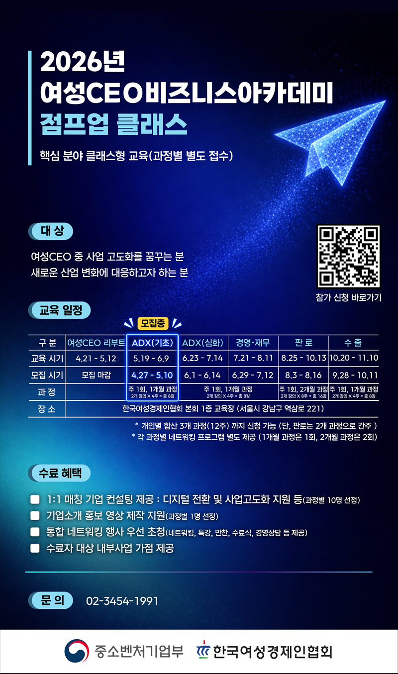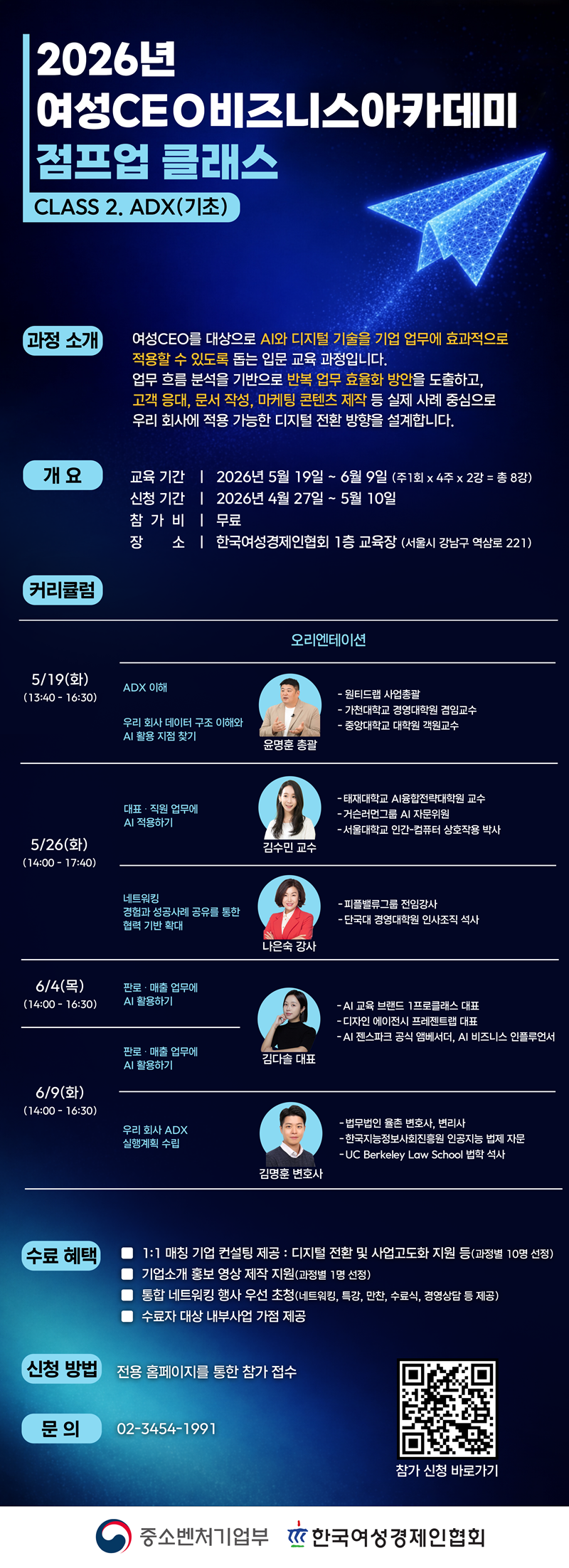 한국여성경제인협회에서 「2026년 여성CEO 점프업 클래스」 'ADX기초 과정' 참가자를 모집합니다.